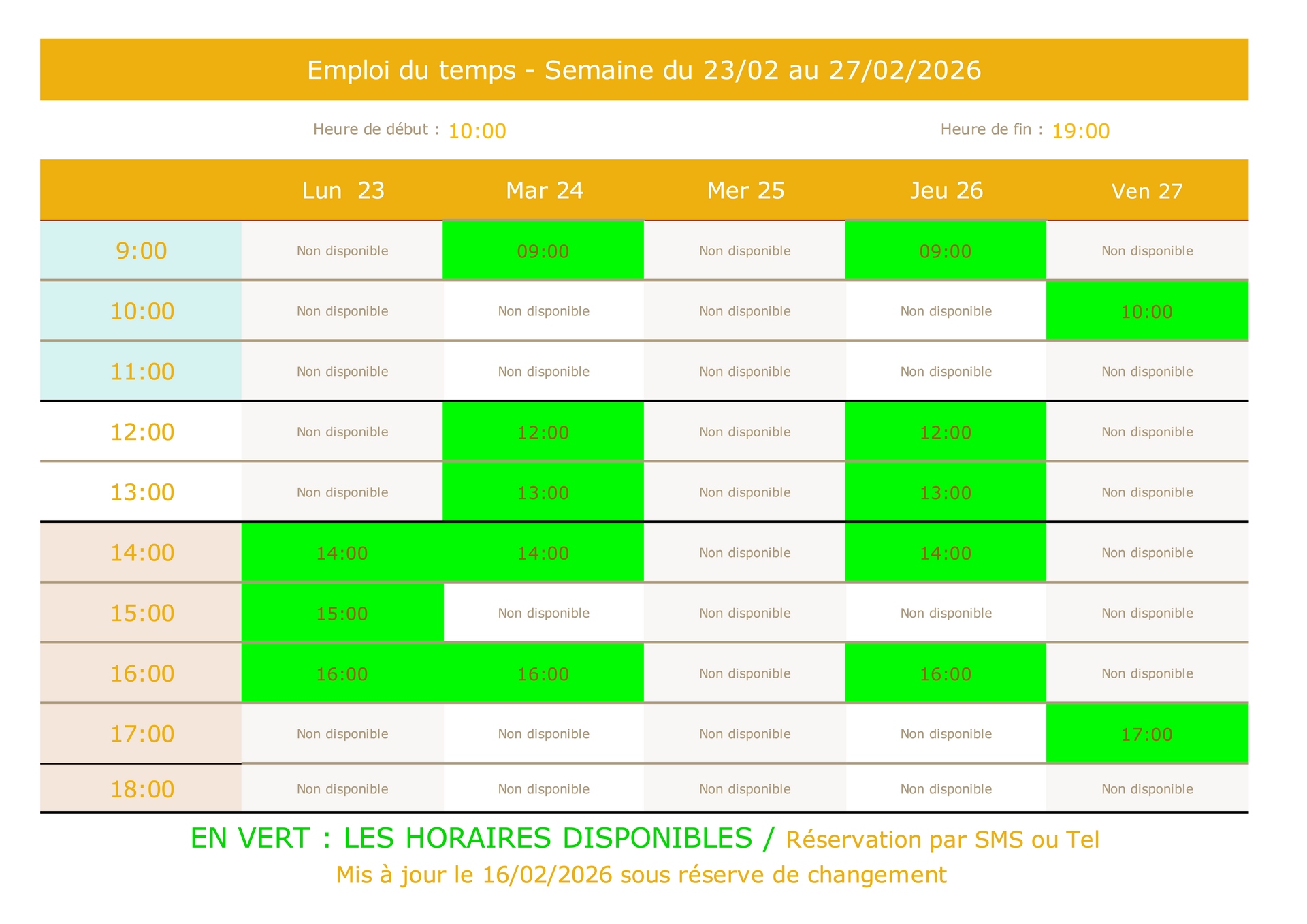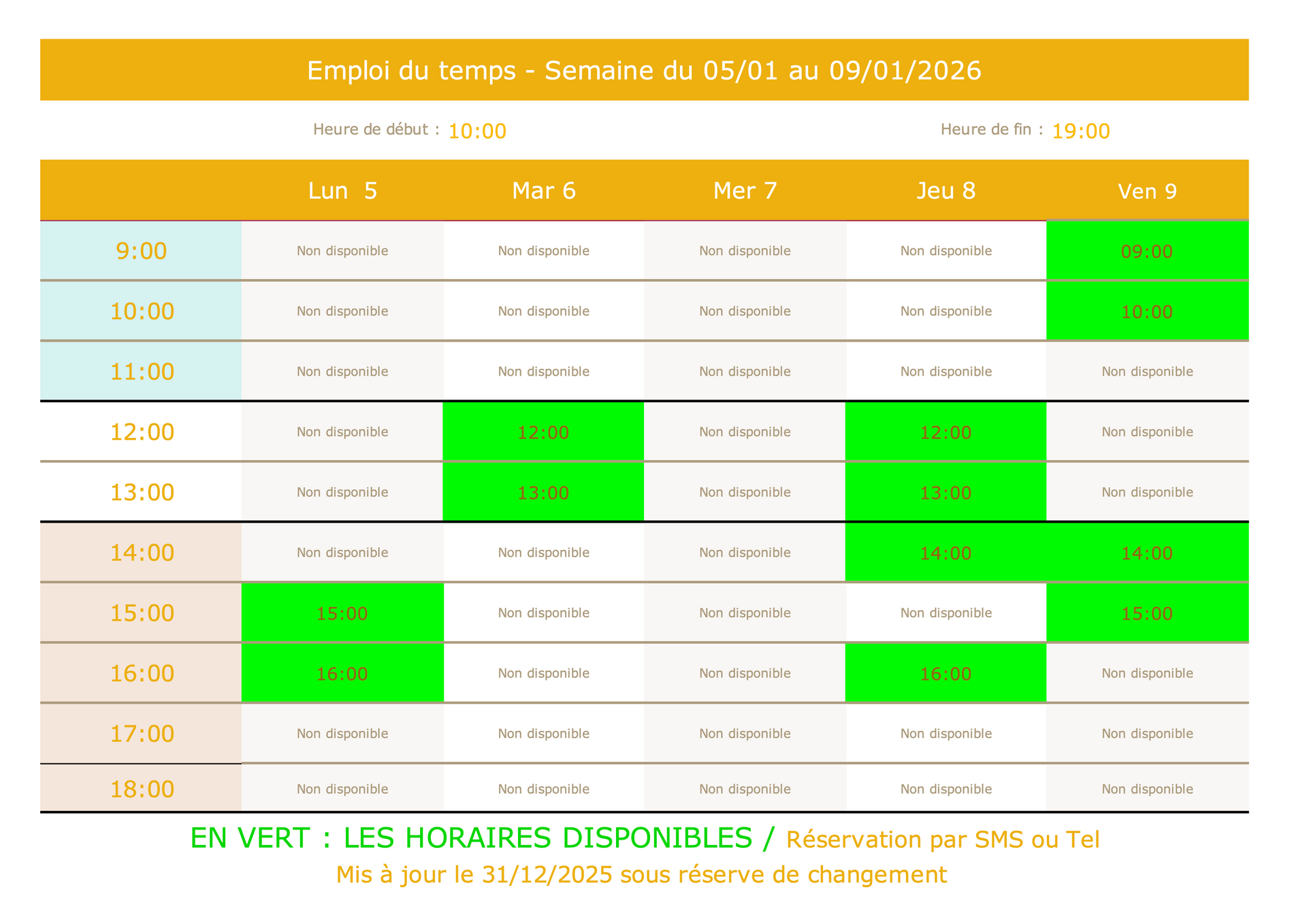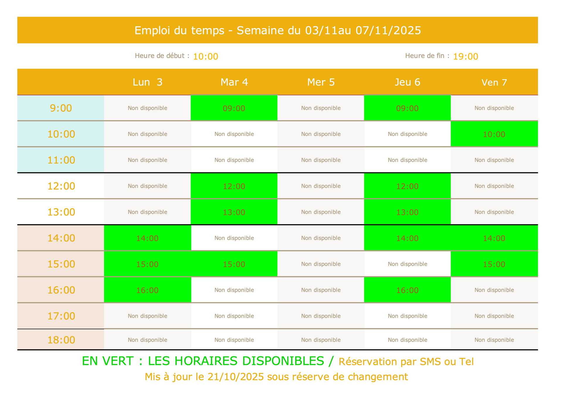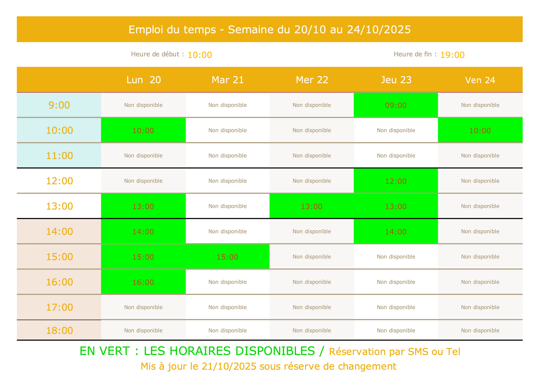 Les horaires disponibles sont en