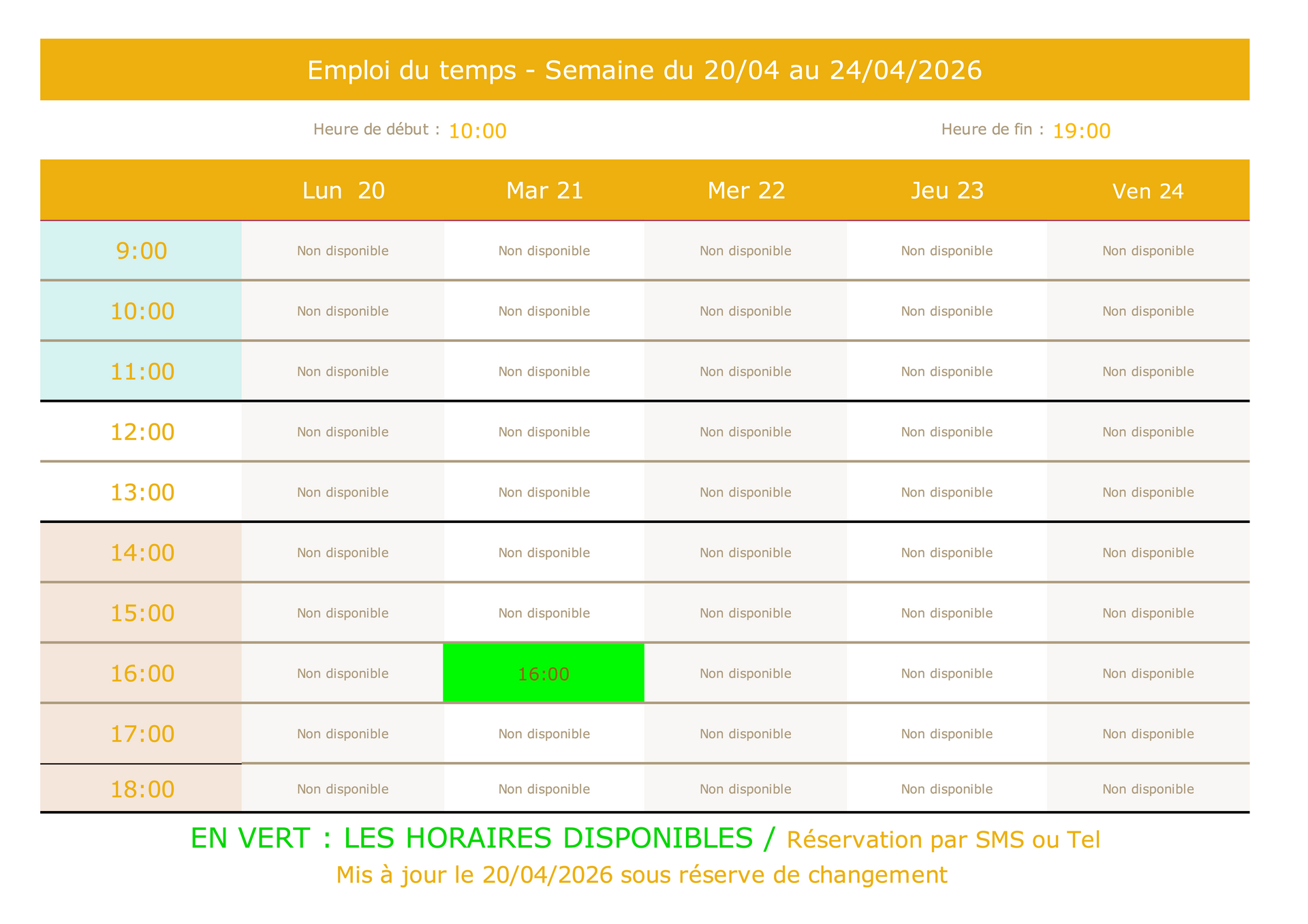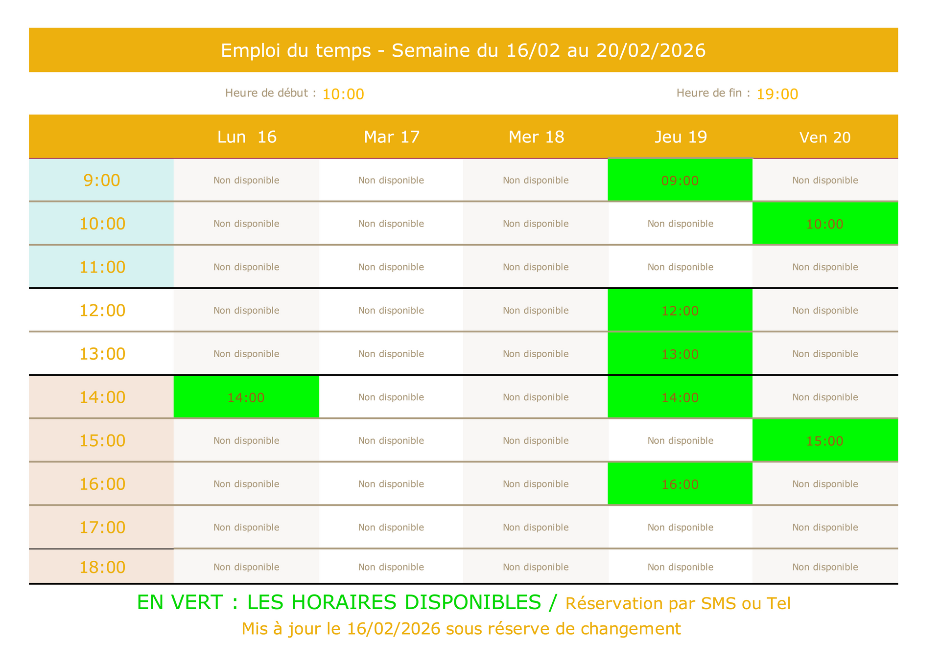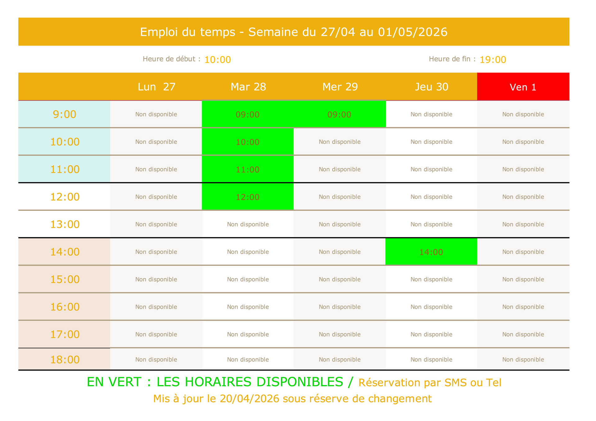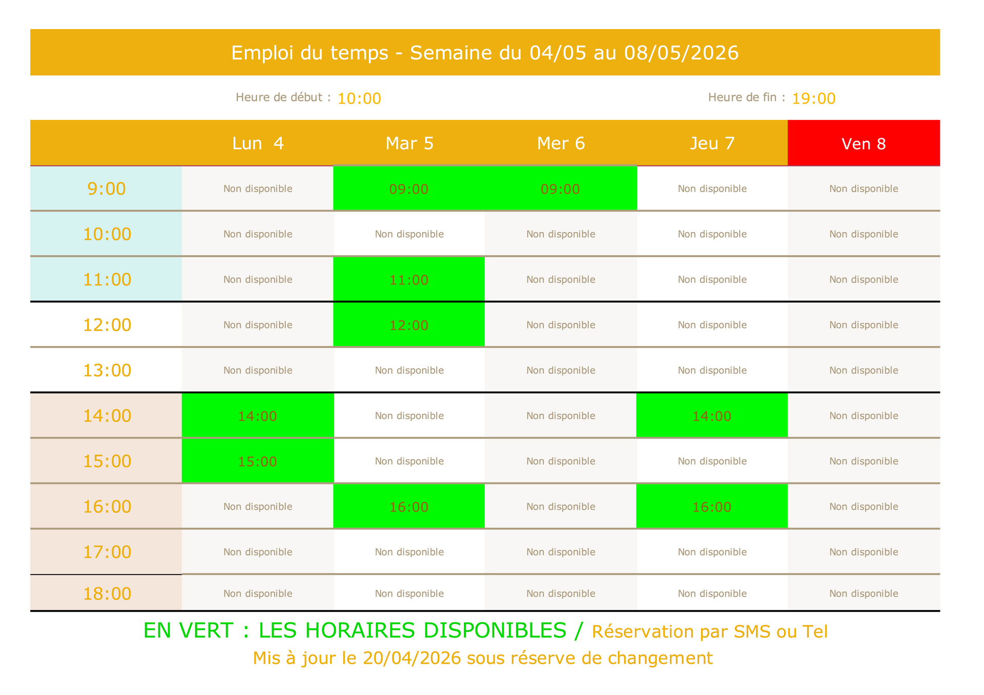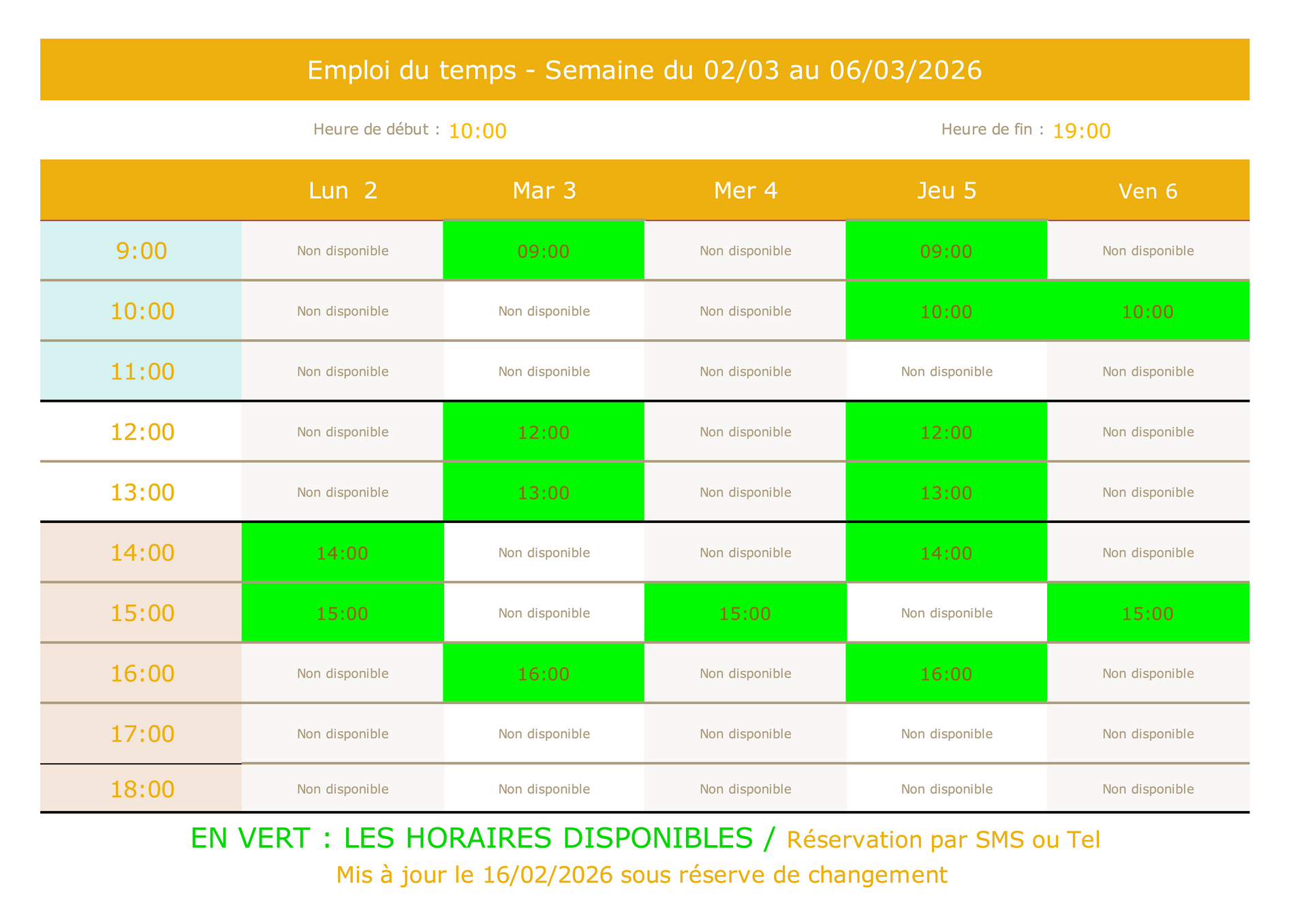 Les horaires disponibles sont en
