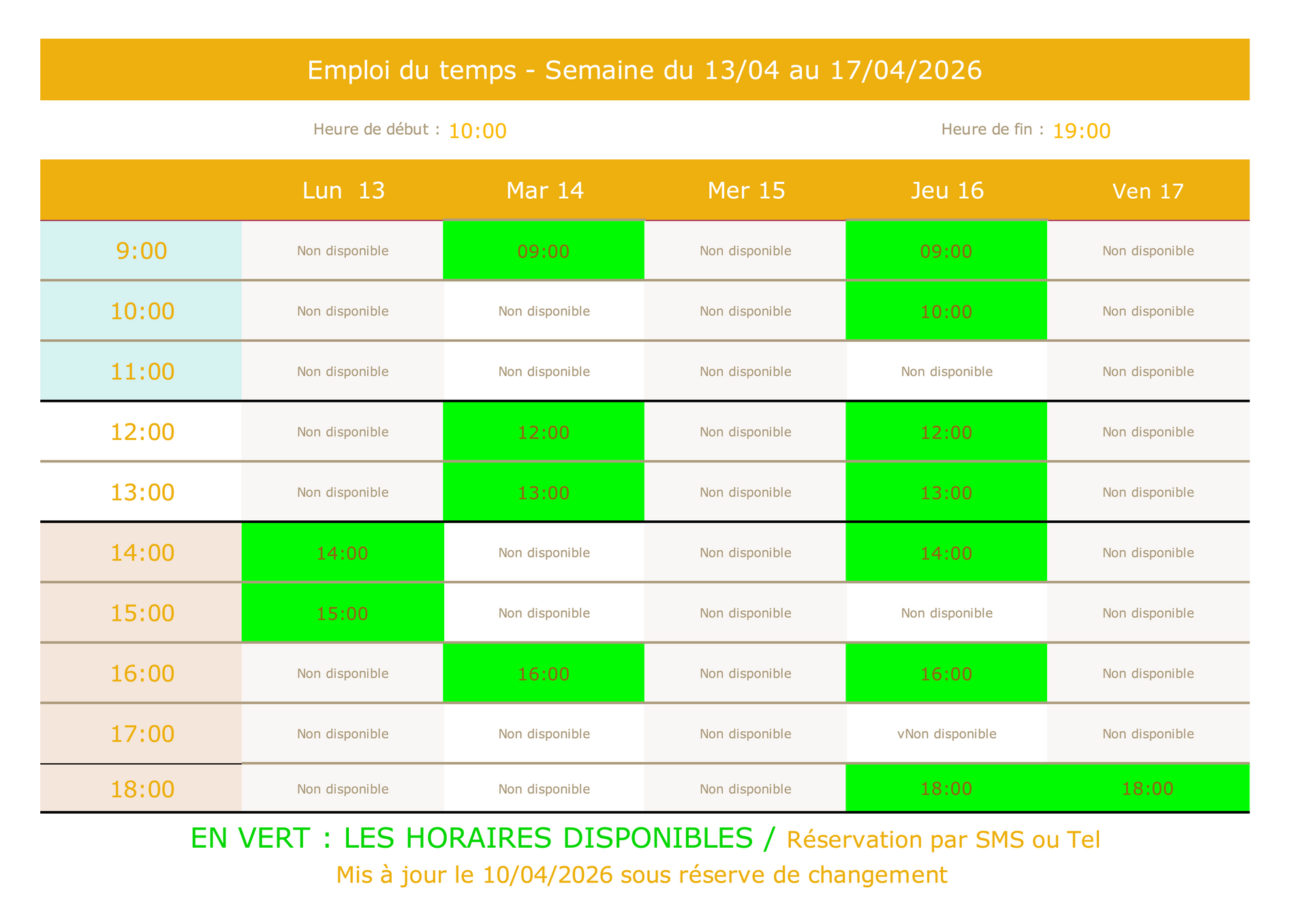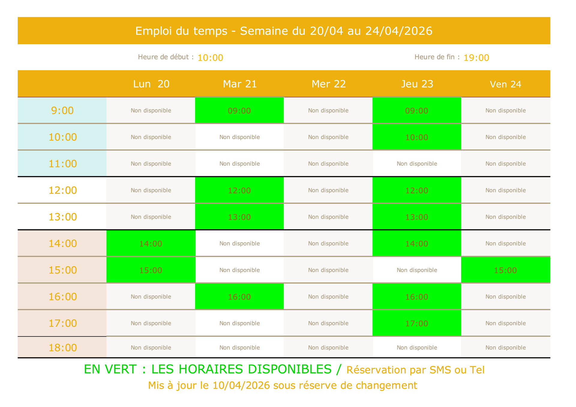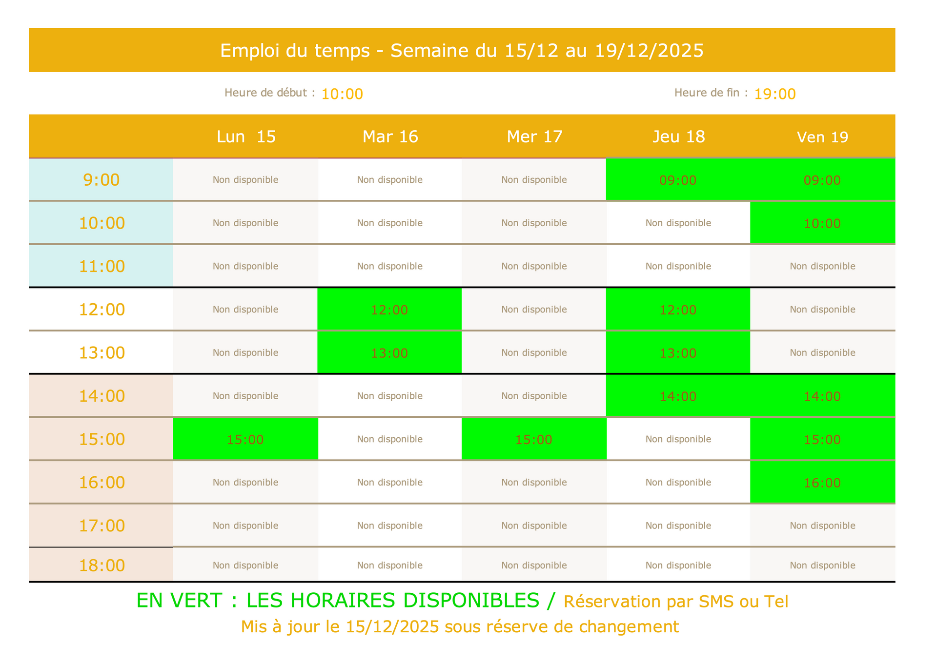 Les horaires disponibles sont en